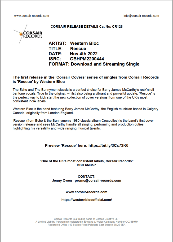 Western Bloc’s cover of Rescue by Echo & the Bunnymen will be released November 4th 2022 on Corsair Records. Described by BBC 6Music as “one of the UK’s most consistent labels”, It is an honour to be featured alongside many other great artists on this forthcoming release