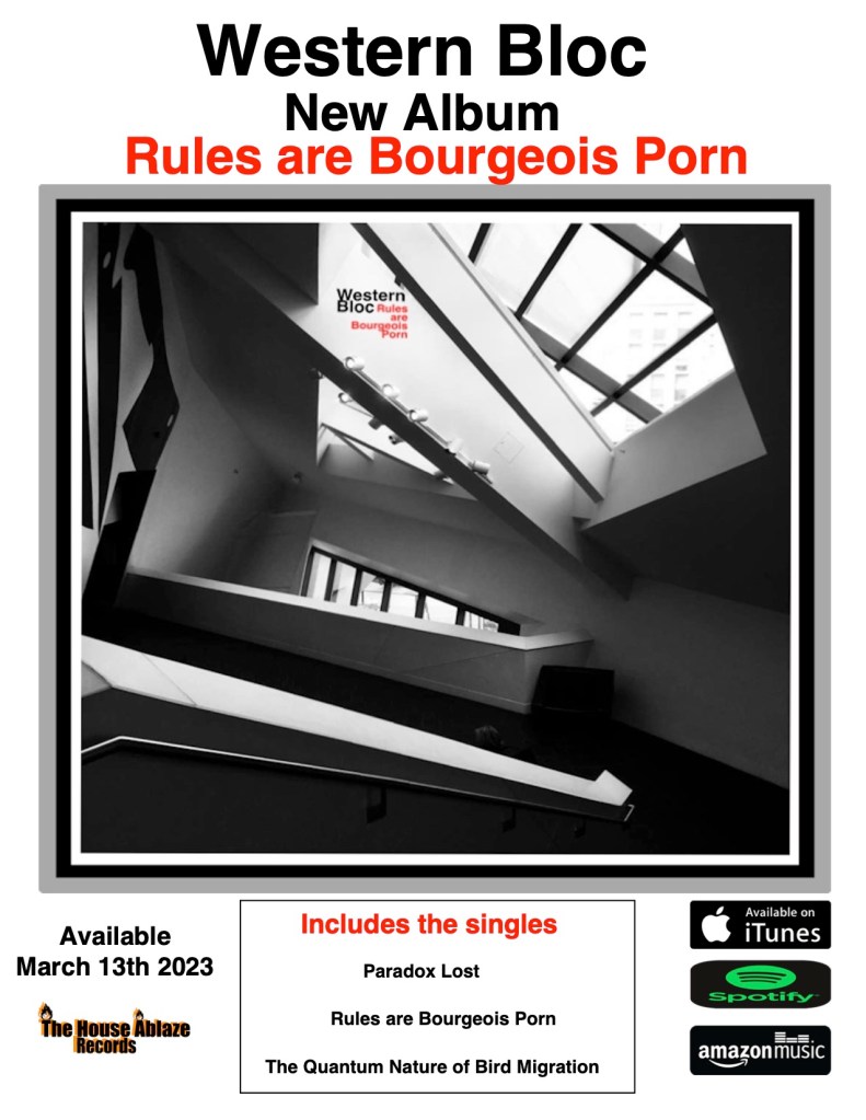 Western Bloc will release their 5th album, Rules are Bourgeois Porn, on March 13th 2023. Recorded between June and October 2022 this is another leap forward with epic songs about the dark days we live in.