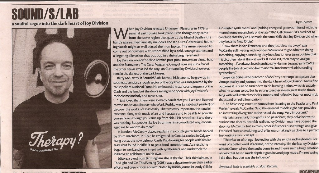 It’s not easy getting reviewed, but here is some feedback for Empirical State: “he has strung together eleven great tracks, throbbing with well crafted melodies, moody and reflective”, “His lyrics are smart, thoughtful and passionate that delve below the surface into heartfelt realities” – Beat Route Magazine, “impressive” – Exclaim Magazine, “a very British sounding pop/electronic album”, ”everything has a sort of atmospheric tinge to it” – Music Emissions Editorial review. “You can hear his English influence in the music, Bowie influence for sure” – CJLY 93.5FM BC. It also made the end of year polls in Beat Route magazine, named by the editor in his local albums of 2011.